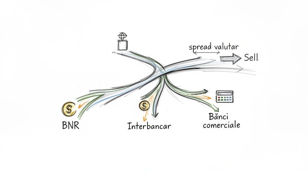 Gândește-te la piața valutară ca la o rețea de drumuri. Cursul BNR este autostrada principală, o medie a pieței. Apoi, există cursul interbancar, o rețea de mare viteză unde băncile mari schimbă sume colosale – o zonă inaccesibilă pentru freelanceri și micii antreprenori.
